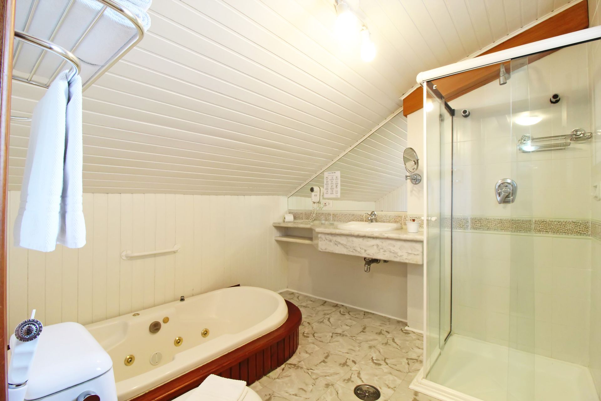 Dotado de banheiro moderno e bem equipado, servido por chuveiro cuja água é pressurizada e aquecida por sistema automático, além de uma Banheira com Hidromassagem, que transformam este apartamento Loft Superior em um refúgio ideal para sua estadia relaxante e confortável.